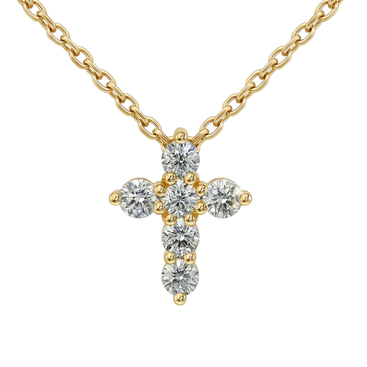 This petite cross necklace features 0.60 carats of round brilliant lab-grown diamonds, delicately set in a timeless silhouette. Measuring 1.5 cm in height and 1 cm in width, the cross pendant is crafted in solid 14k gold and suspended from a classic 16-inch chain—an everyday expression of faith, love, or personal meaning.